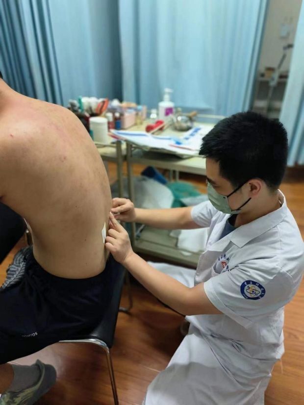 電子科技大學(xué)醫(yī)院主治醫(yī)師林鈺久正在為一位市民貼三伏貼